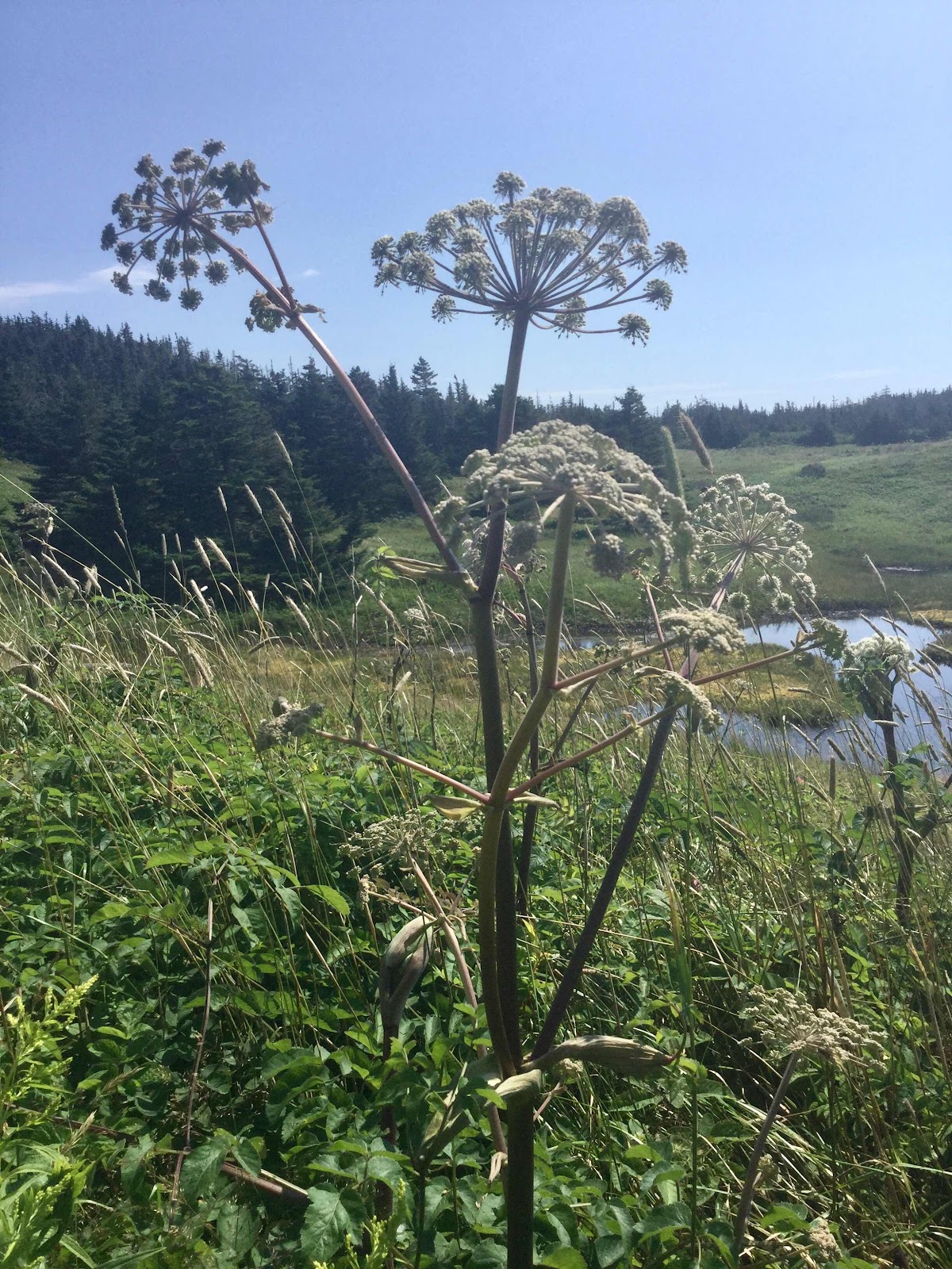 Wild angelica is blooming here at Oceanside Wild and on the hillsides around us. All manner of bees and other pollinating insects are drawn to the flowers which are known as plentiful pollen providers. The plants grow a couple of metres tall and branch out robustly. The bottom picture shows how deeply they root. The stems of seacoast angelica (angelica lucida) are eaten as wild celery. Wild angelica (angelica sylvestris) is seen as having been brought to Cape Breton by the French and is commonly viewed as an invasive species, having proliferated. However, angelicas are native to temperate and sub-Arctic regions of the northern Atlantic and Pacific coasts. The roots and seeds are sometimes used to flavour gin. Its presence accounts for the distinct flavour of many liqueurs, such as Chartreuse. Angelica sylvestris roots have been used in the traditional Austrian medicine internally as tea or tincture for treatment of disorders of the gastrointestinal tract, respiratory tract, nervous system, and also against fever, infections, and flu.